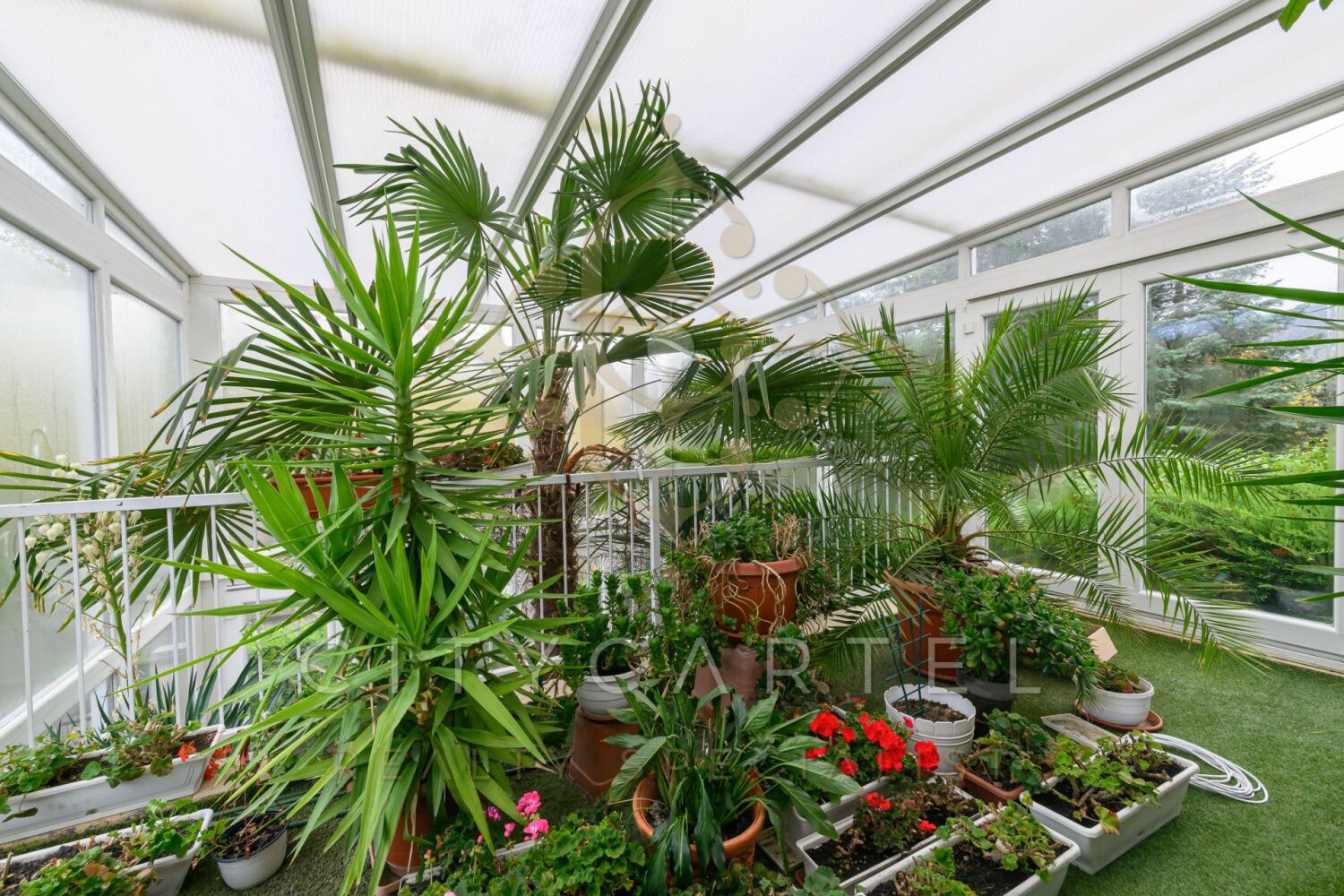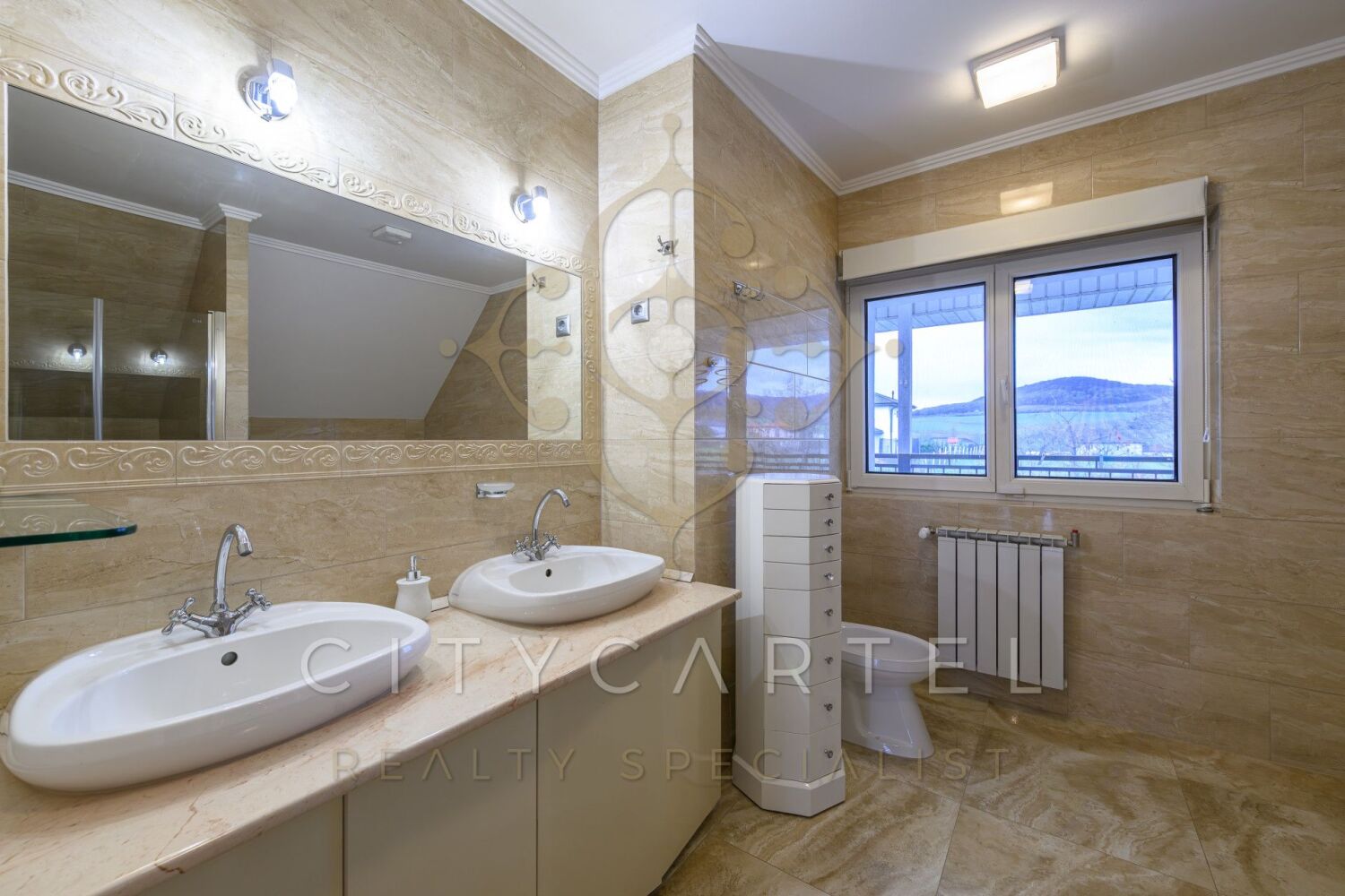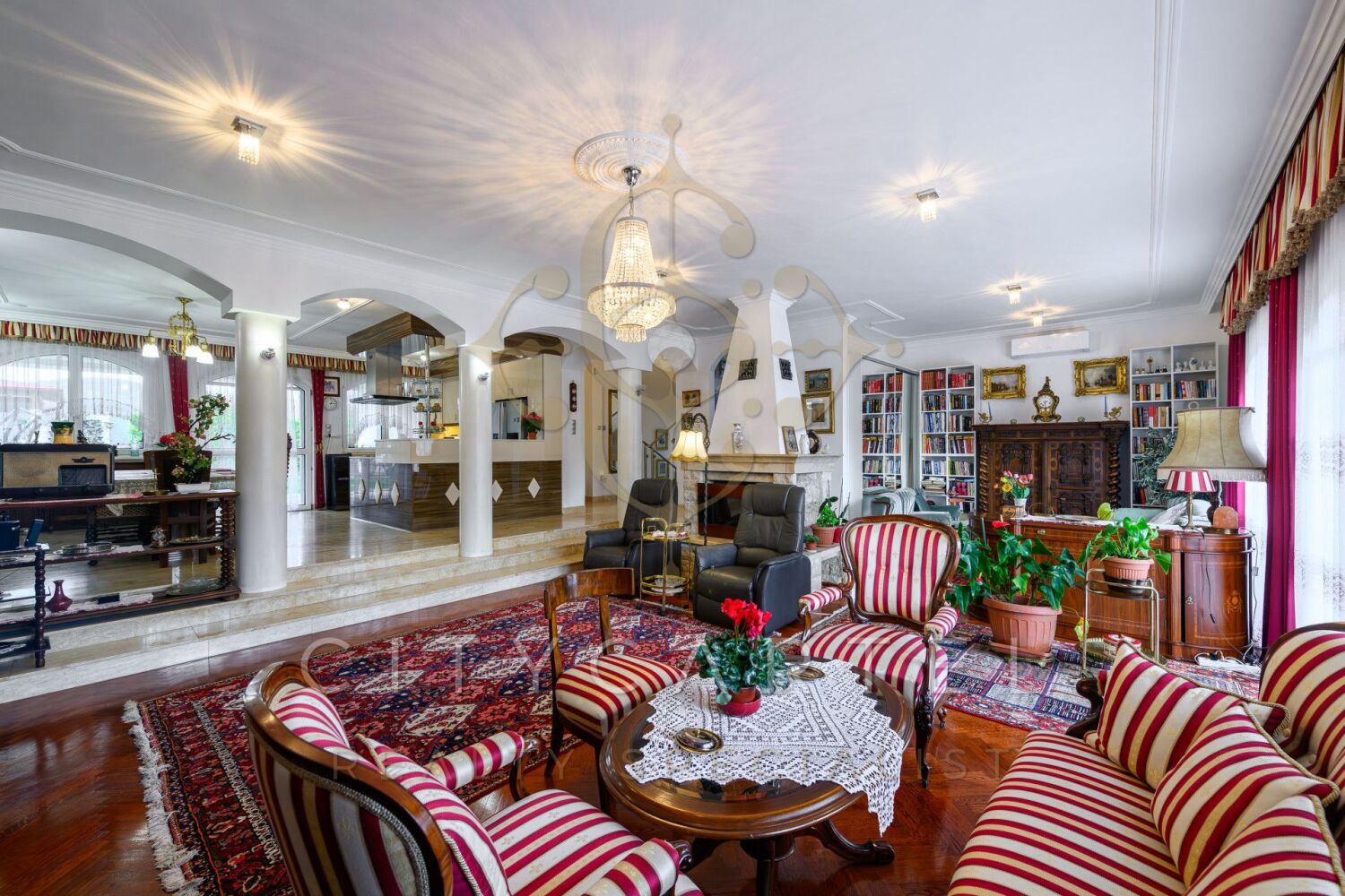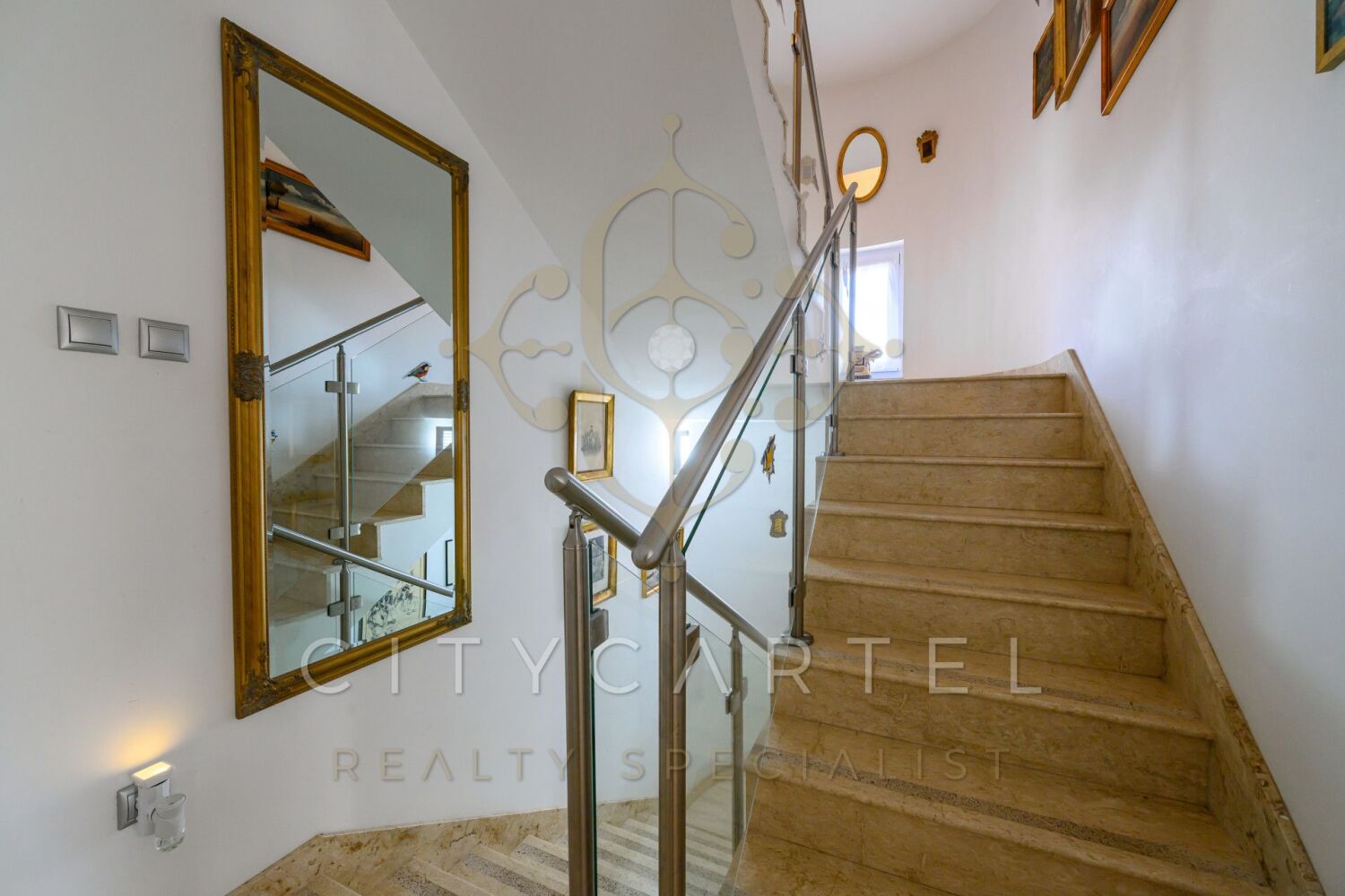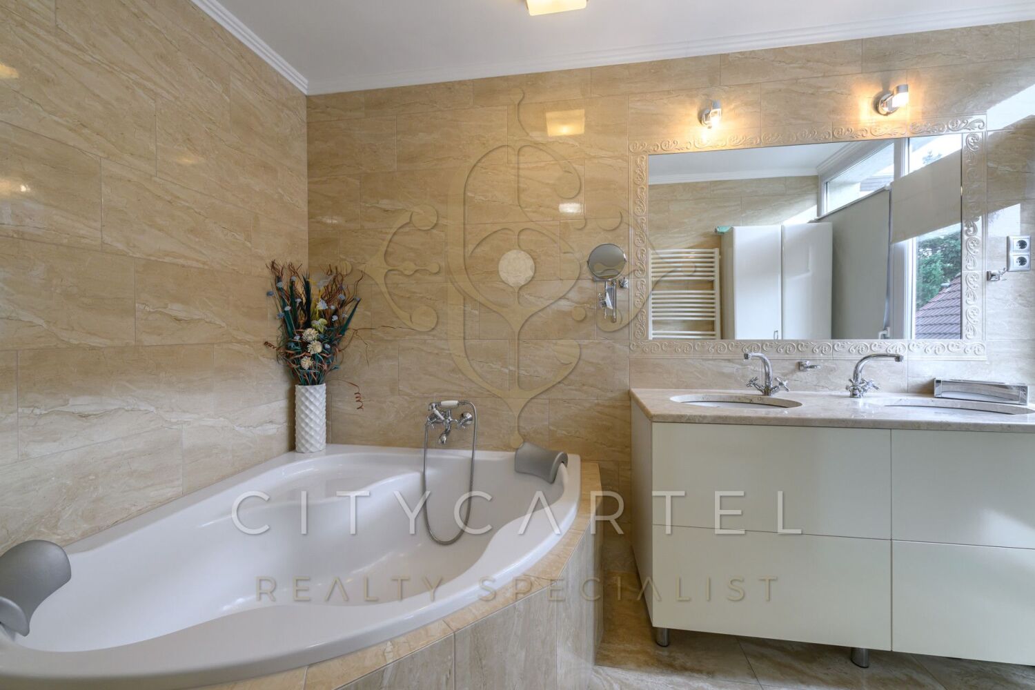 The house is located in the upper (rear) part of the 800 sqm lot, with a double garage on the lower level, and a wellness area next to it: here you can find the indoor swimming pool, JACUZZI, sauna, fitness room, utility rooms, laundry room.