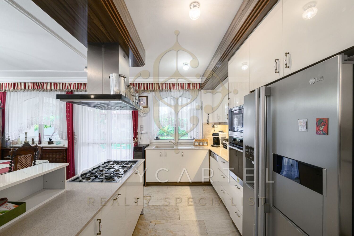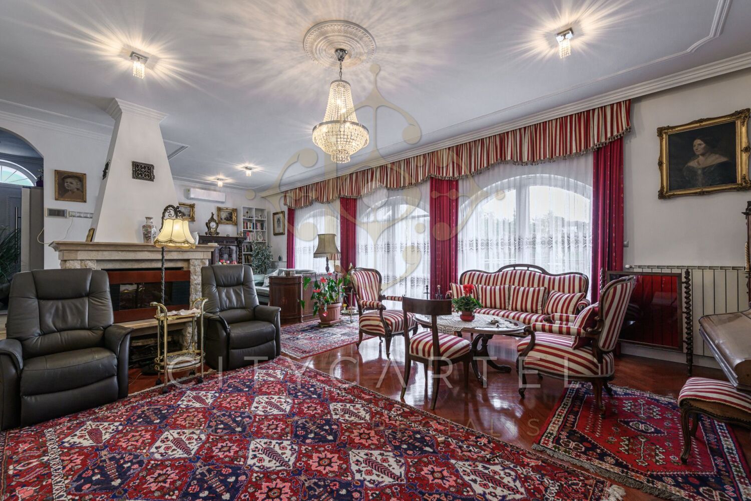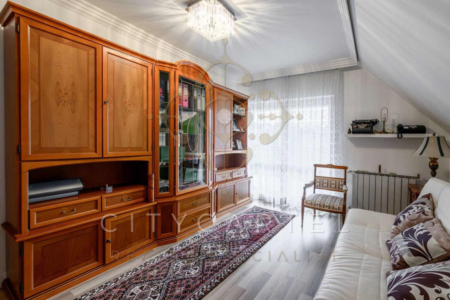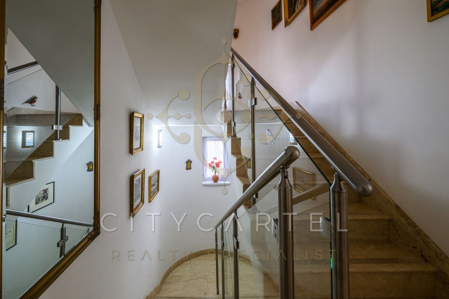 The house is located in the upper (rear) part of the 800 sqm lot, with a double garage on the lower level, and a wellness area next to it: here you can find the indoor swimming pool, JACUZZI, sauna, fitness room, utility rooms, laundry room.
