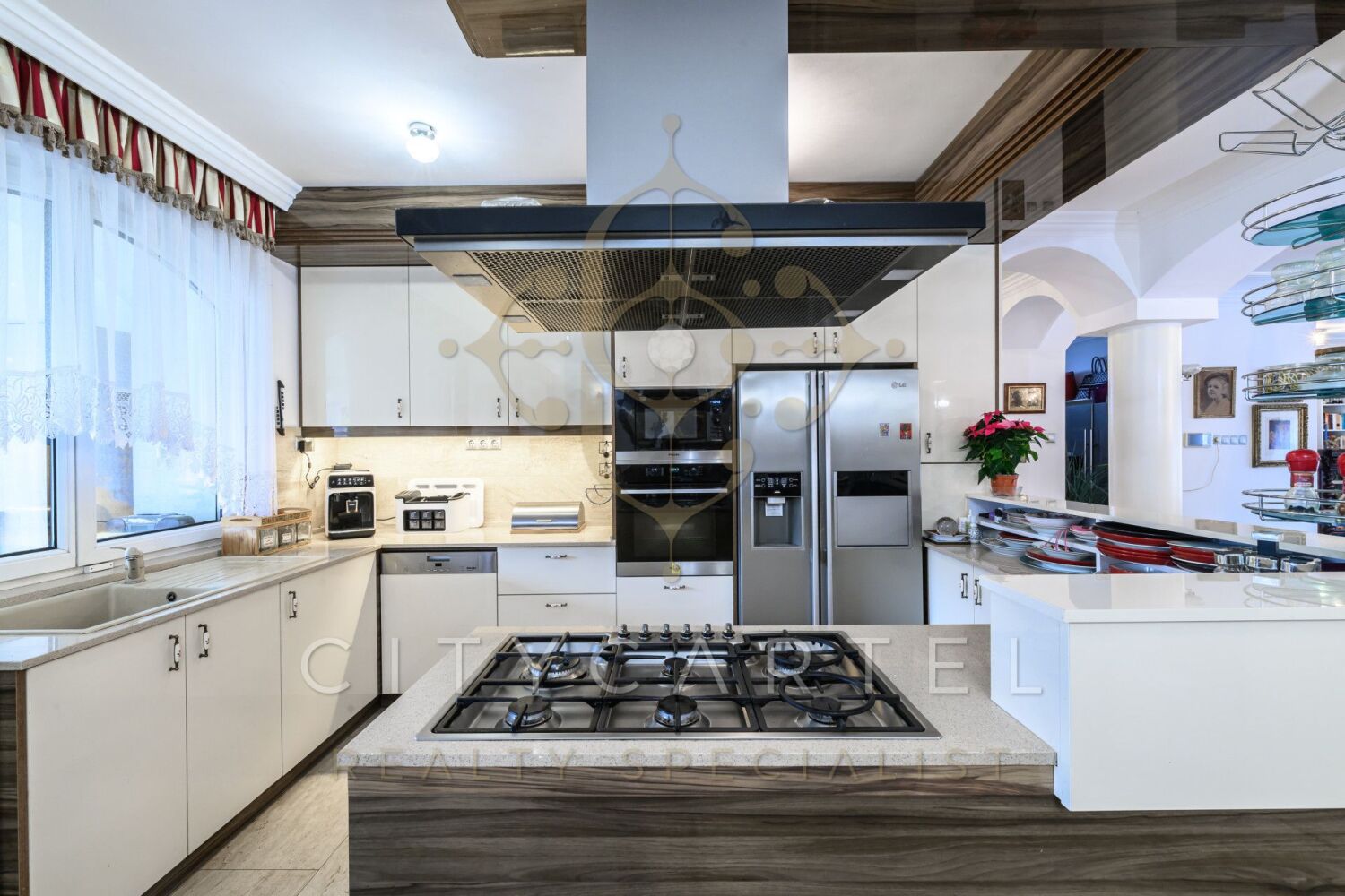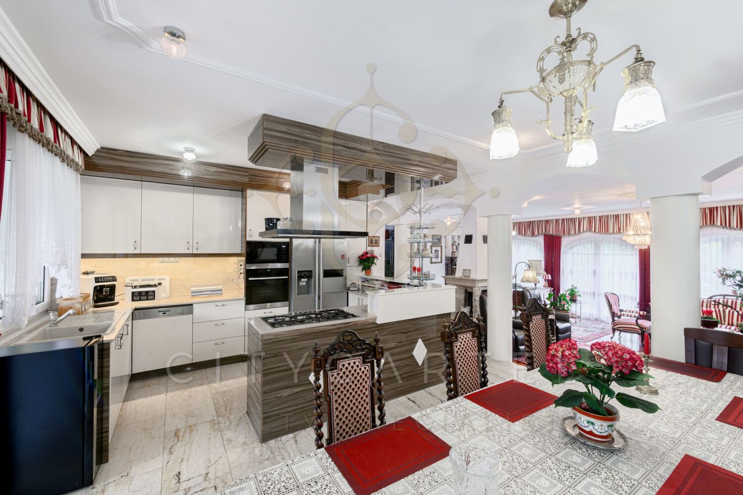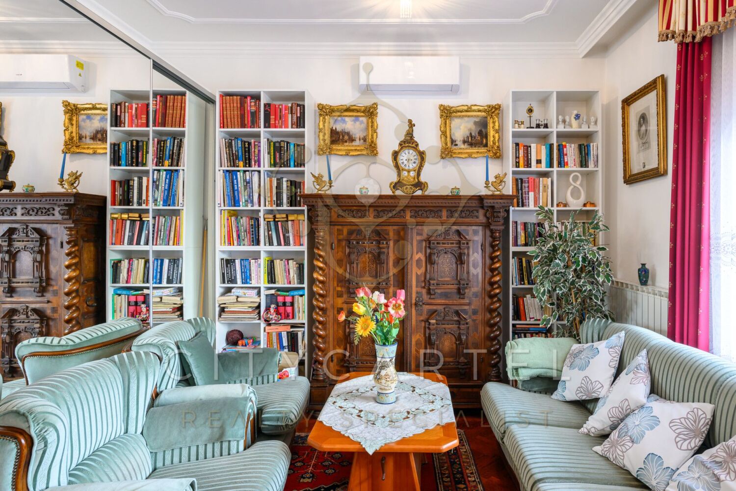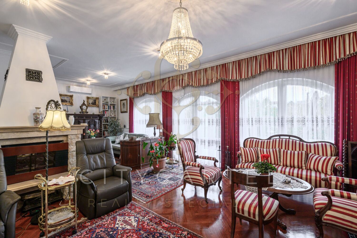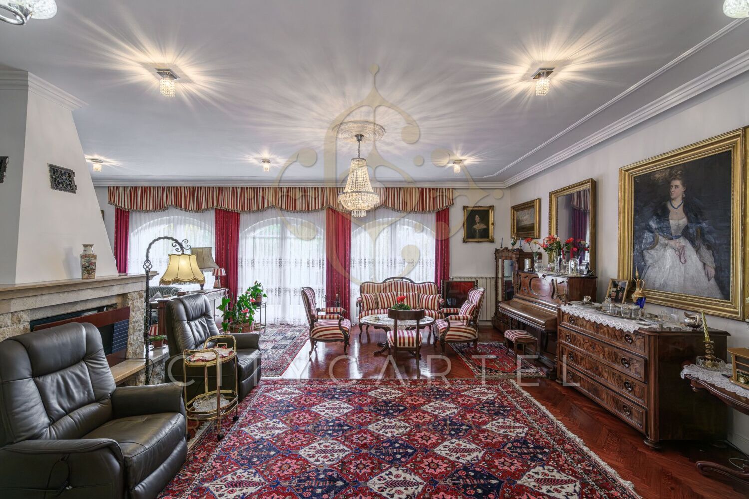 The house is located in the upper (rear) part of the 800 sqm lot, with a double garage on the lower level, and a wellness area next to it: here you can find the indoor swimming pool, JACUZZI, sauna, fitness room, utility rooms, laundry room.