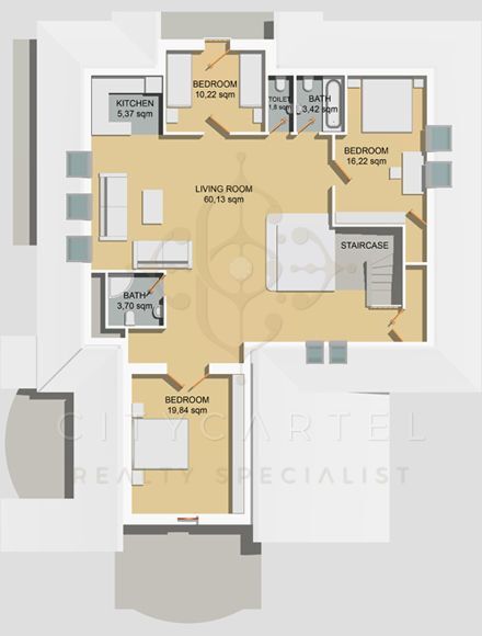 A belső kétszintes lakás teljes alapterülete 152 m², amelyhez összesen 101 m², összesen öt db terasz tartozik – mindegyik más funkcióval. A nagy, déli fekvésű napozóteraszon akár egy grillparti is tartható, míg a fedett, hangulatos erkély ideális hely egy csésze kávéhoz vagy egy jó könyvhöz.