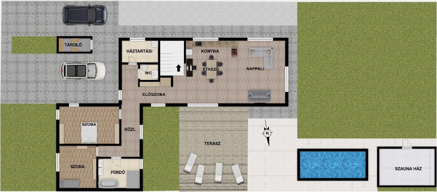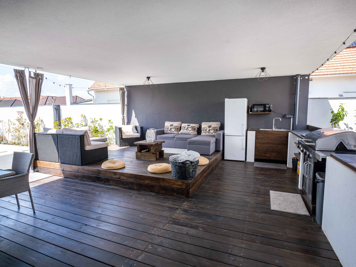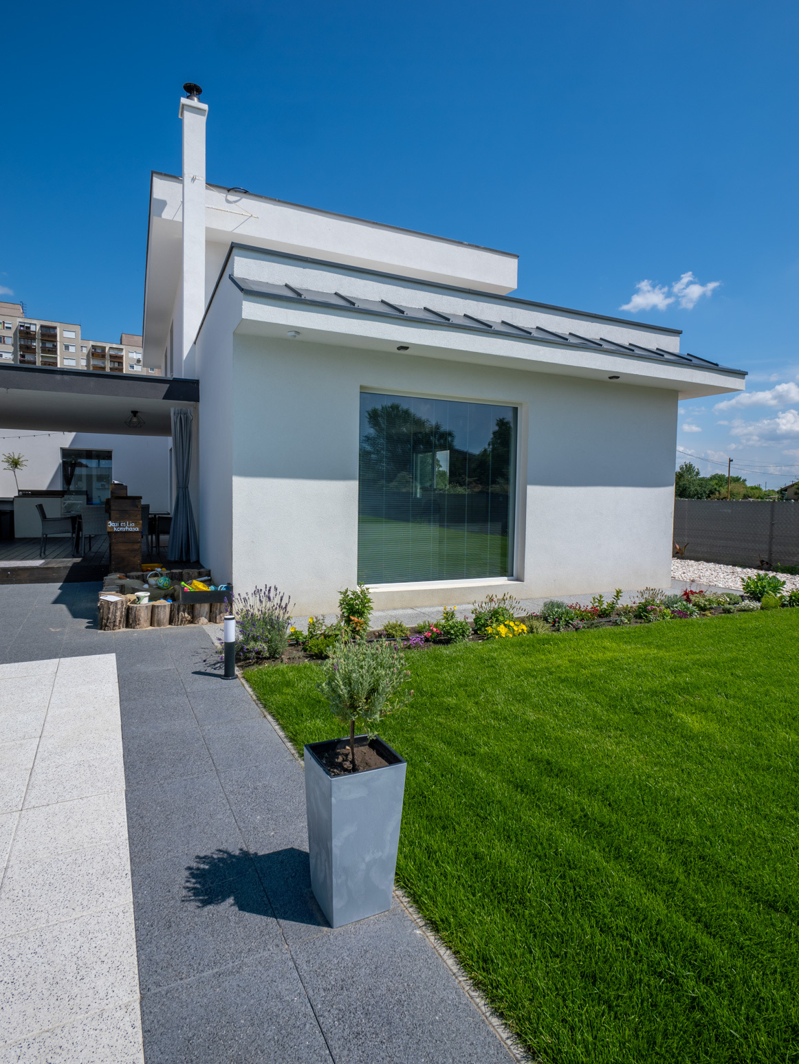 A kertben kialakításra került egy 3x7 méteres fűthető medence, hatalmas, 50 nm-es fedett terasz nyári konyhával, valamint jakuzzi is elhelyezésre került.