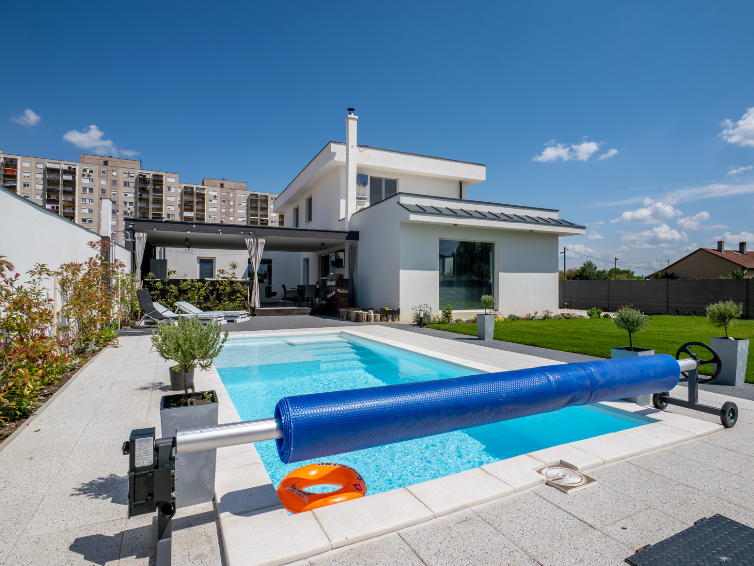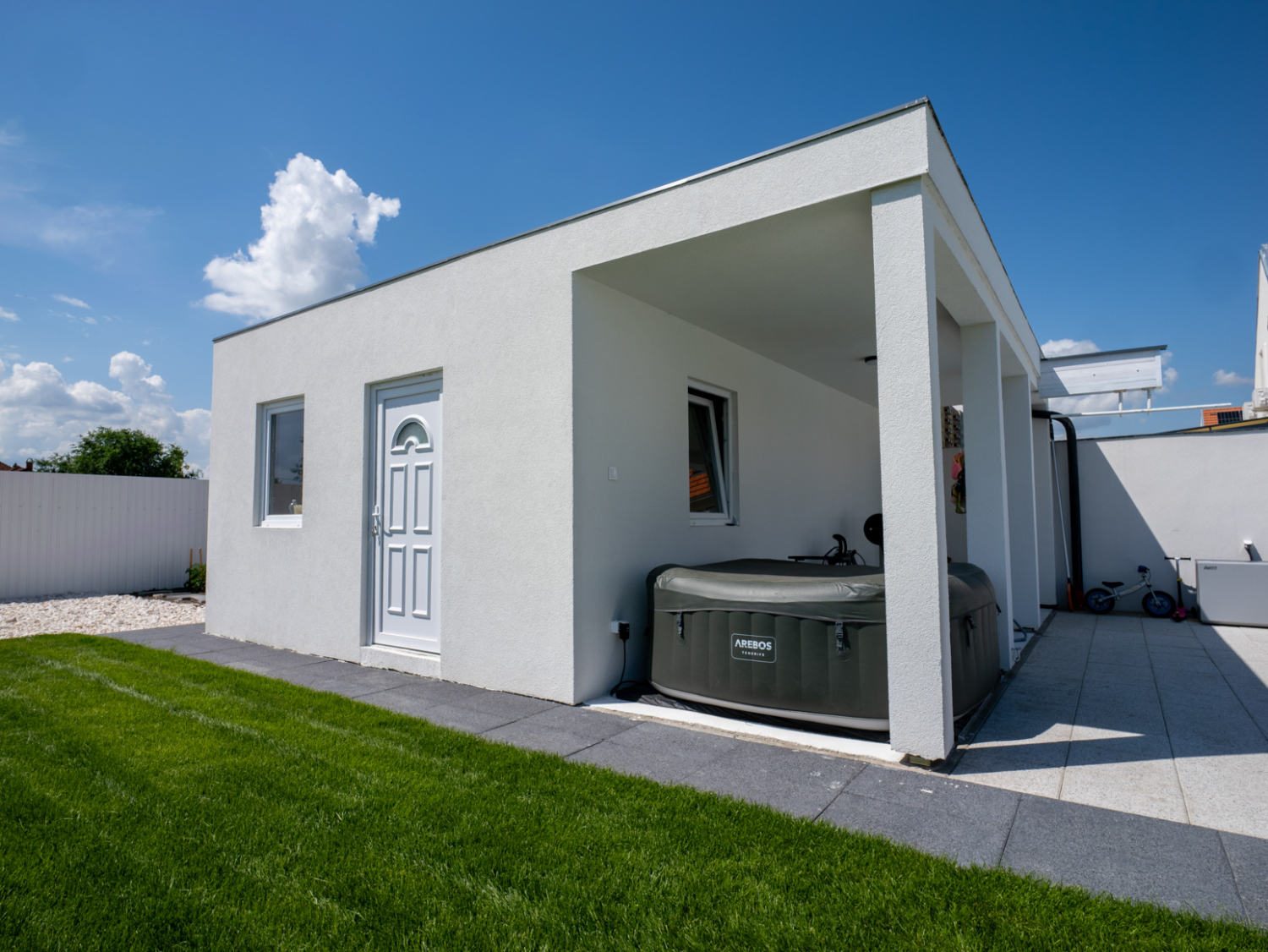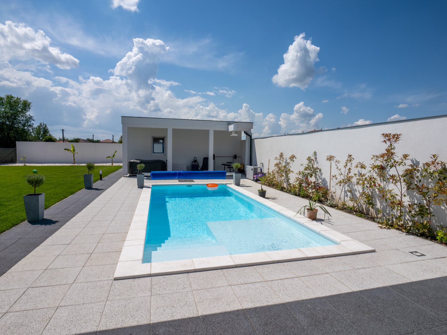 Eladó Szolnok központjában, egy teljesen körbekerített, intim, medencés, világos, csendes, minden igényt kielégítő luxusház, medencével, jakuzzival, AA++ energetikával.