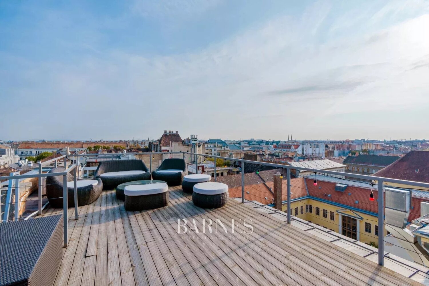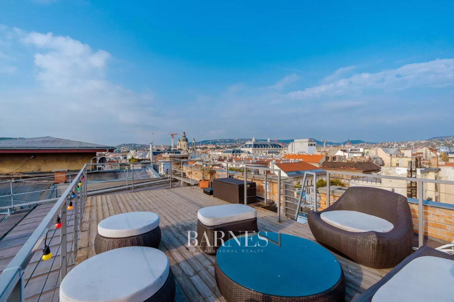 A második szintről közelíthető meg a 30 m2-es panorámás tetőterasz, kilátással a Bazilikára, az Operaházra és a belváros környező épületeire.