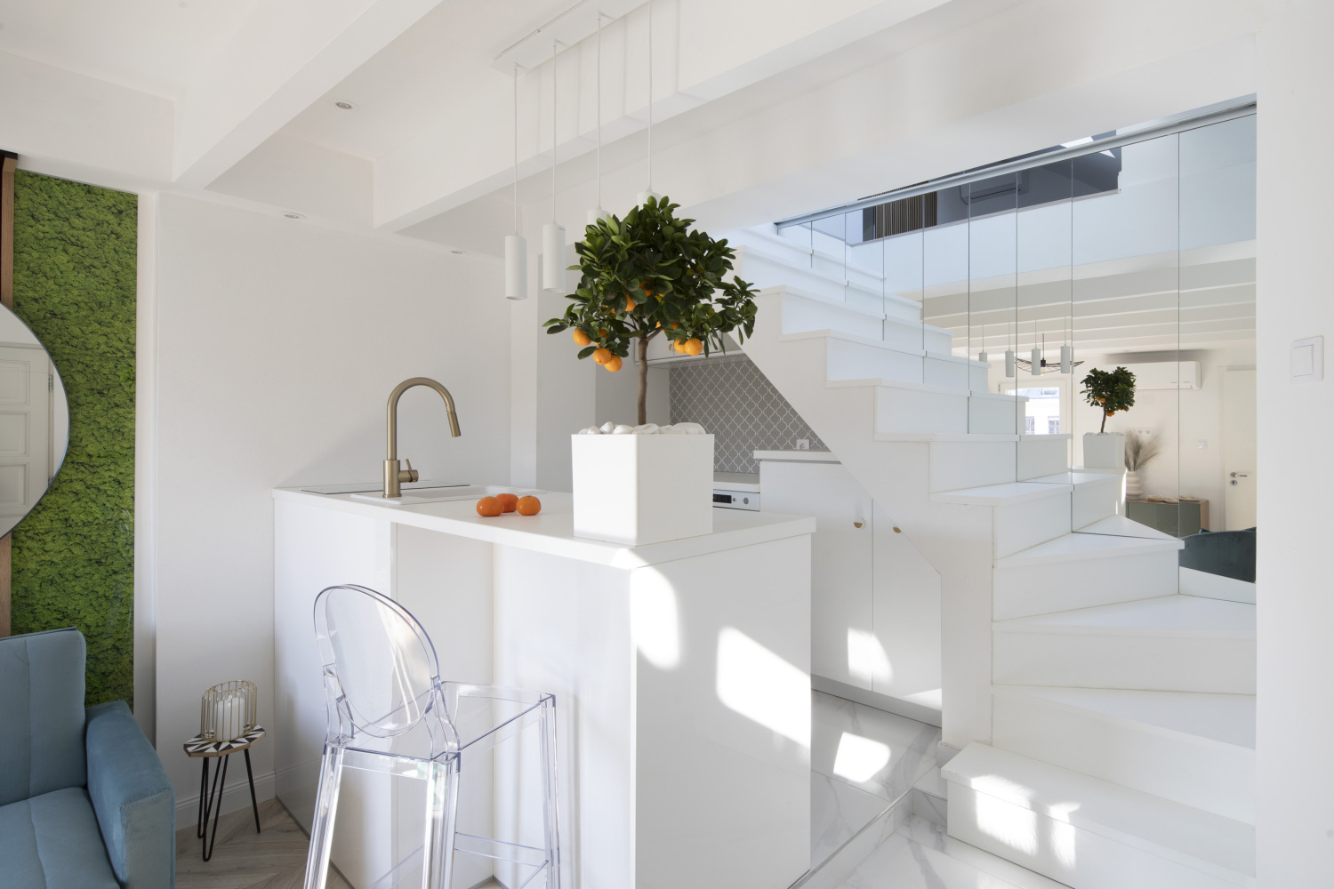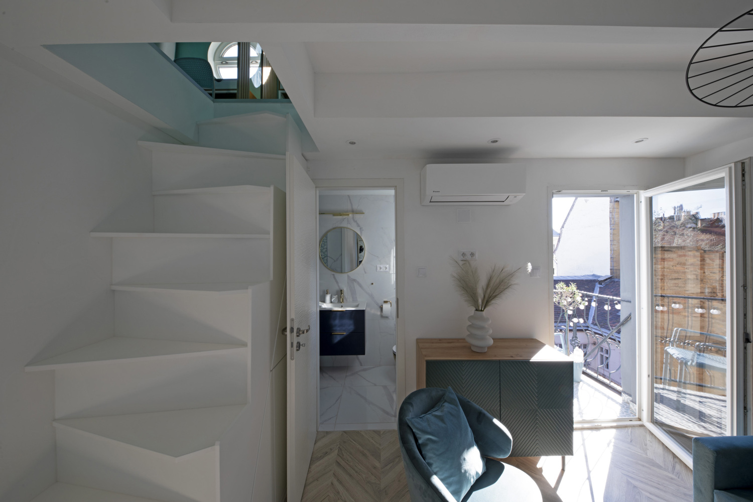 The upper level houses also a separate tiny office with window. The heating- cooling is provided by two energy saving premium Daikin air conditioners and floor heating in the bathroom. The price includes all furniture and appliances.