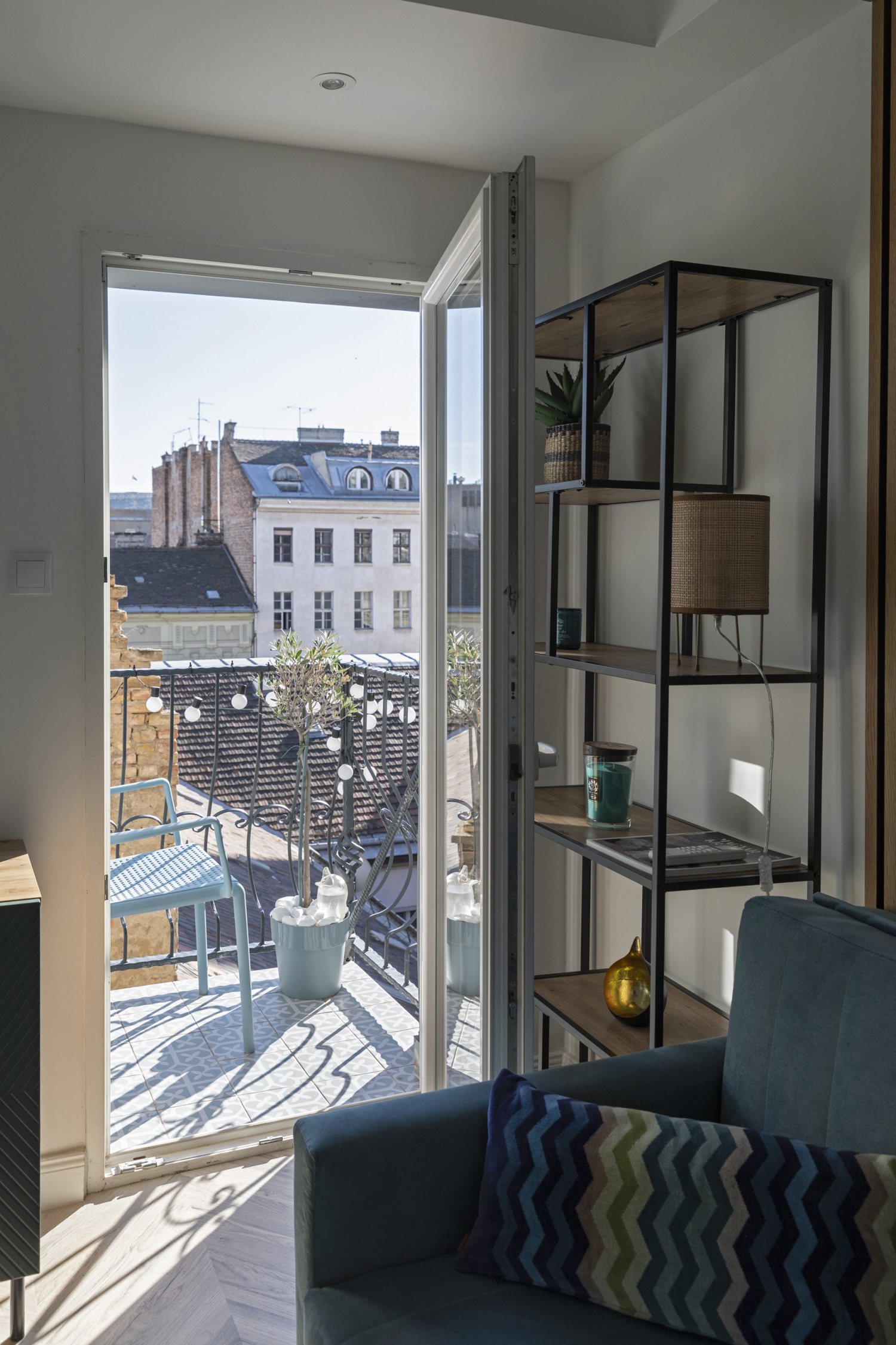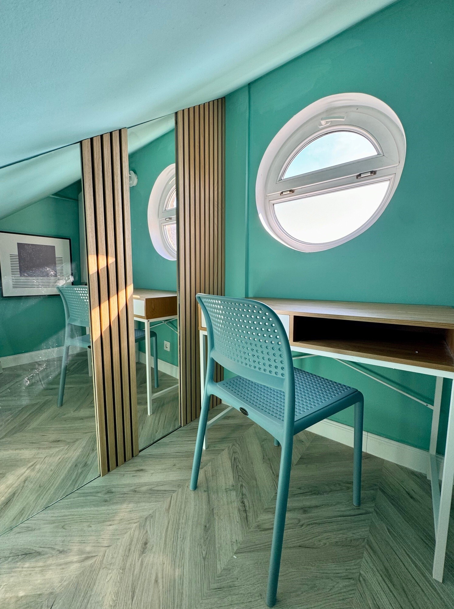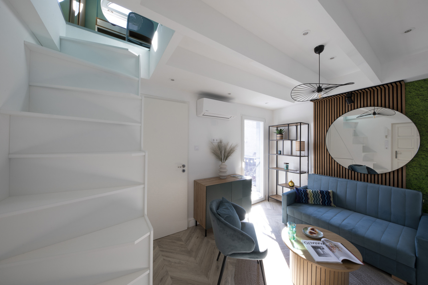 The apartment is very luminous, thanks to the 2 Velux windows and the terrace door.