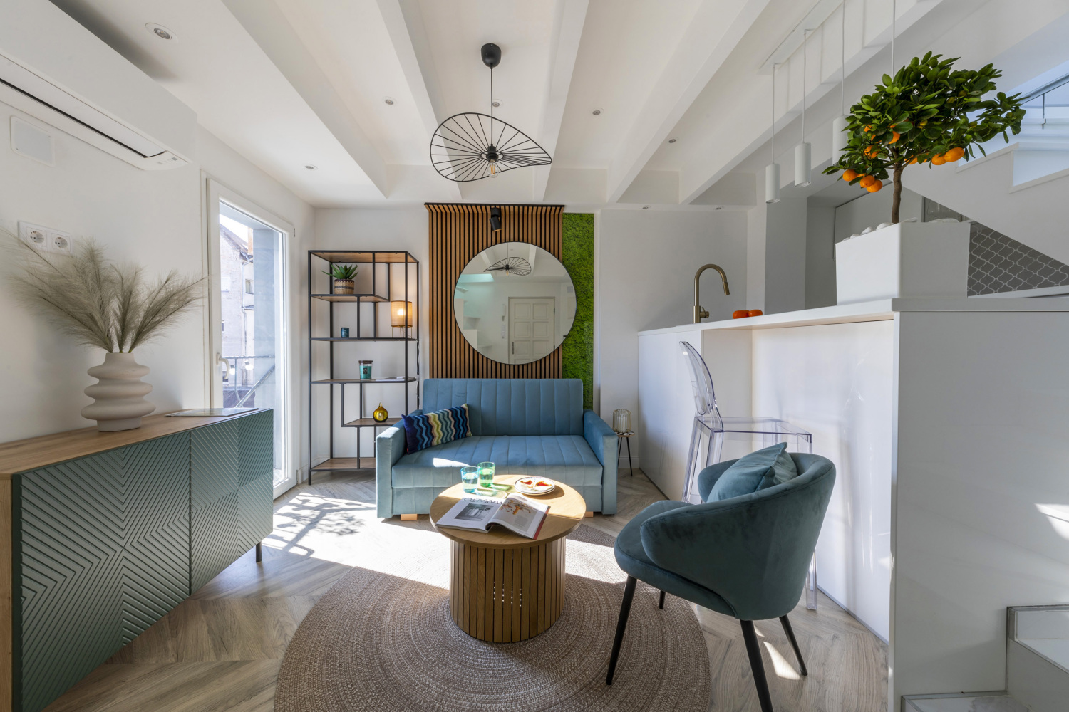 Die Heizung und Kühlung erfolgt über zwei energiesparende Premium Daikin Klimageräten und eine Fussbodenheizung im Bad. Der Preis beinhaltet alle Möbel und Geräte.