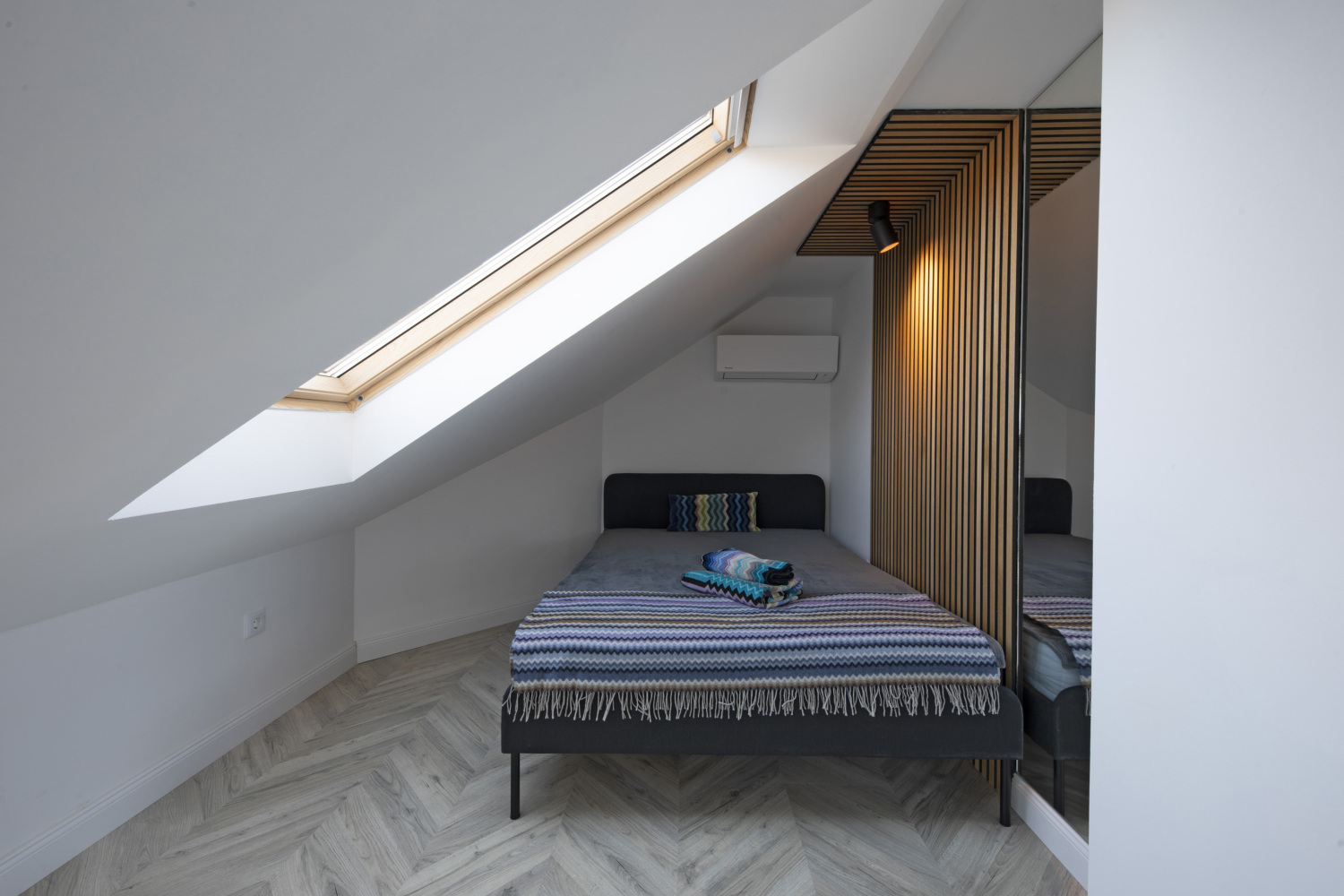 Al livello superiore si trova la camera da letto, che ha due finestre Velux molto luminosa.