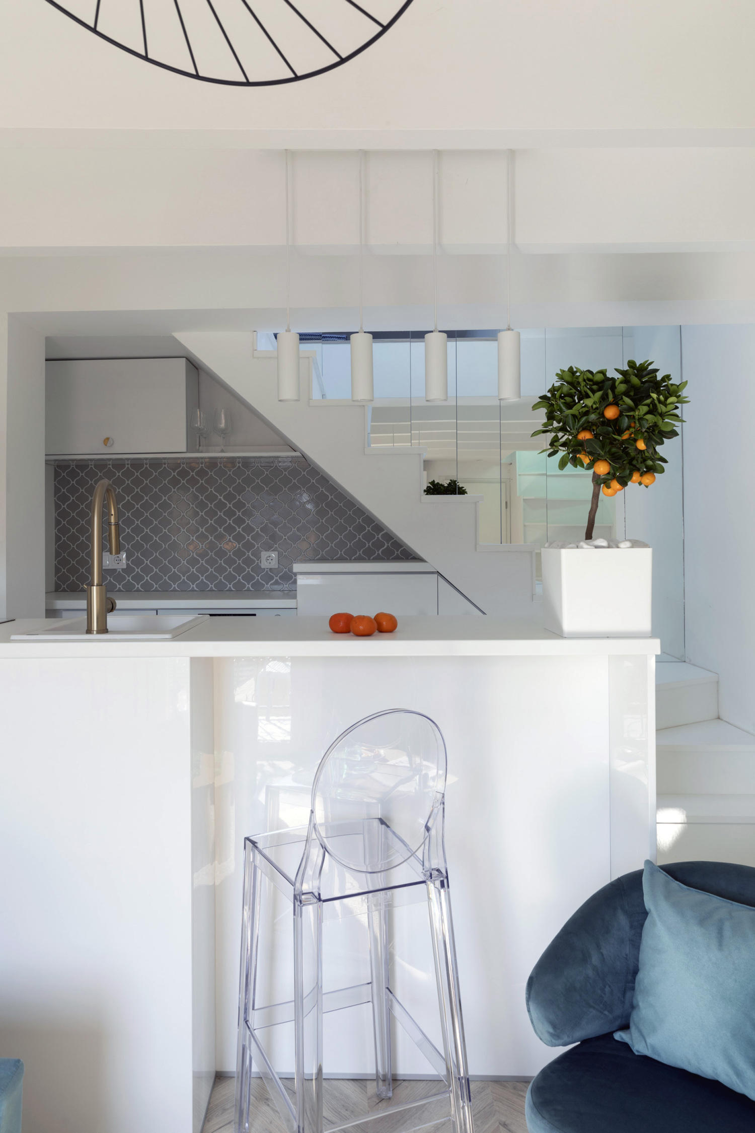 On the lower level you will find the living room, the fully equipped kitchen, the bathroom and a small balcony. On the upper level is the bedroom, which has two windows.