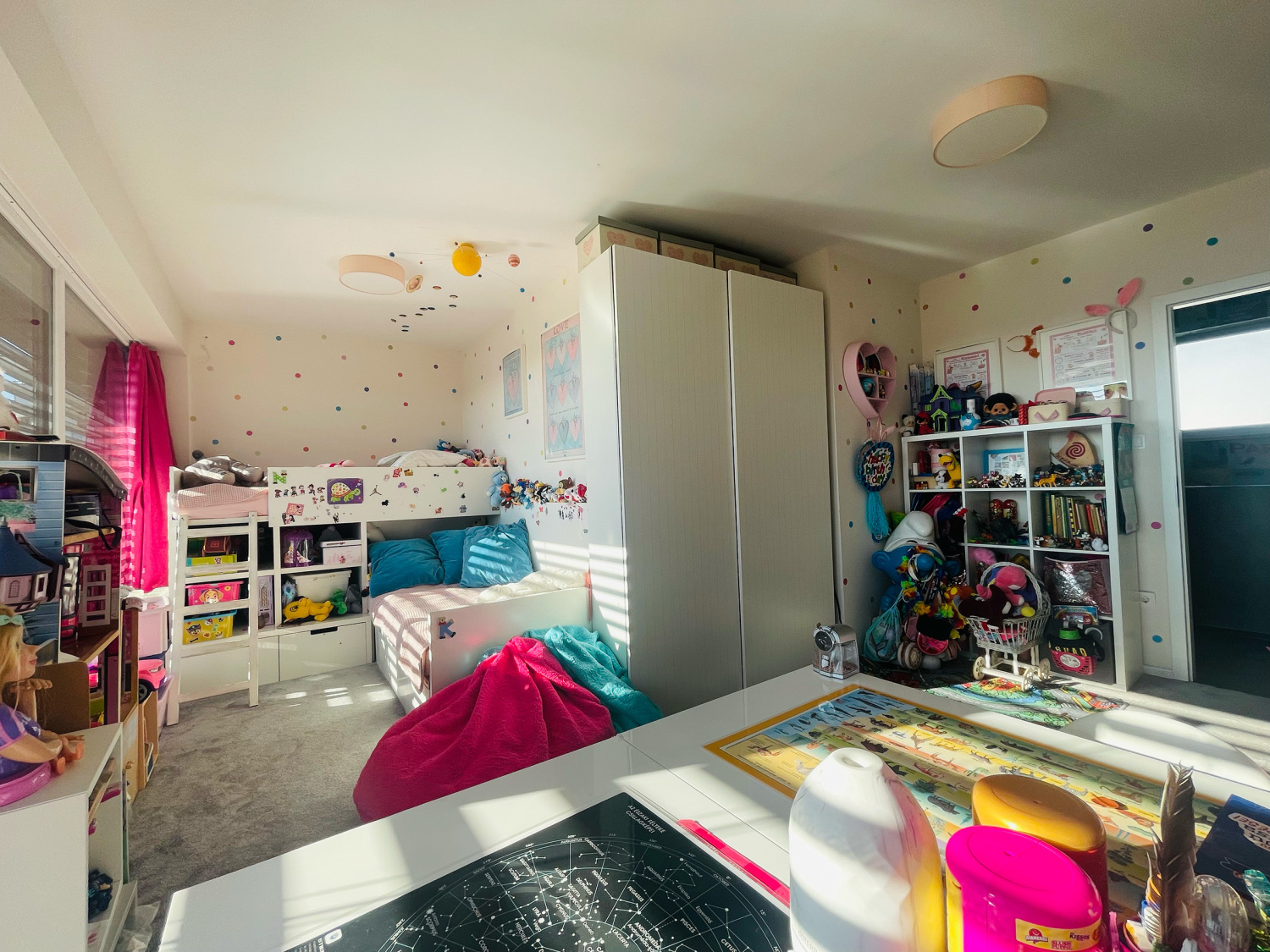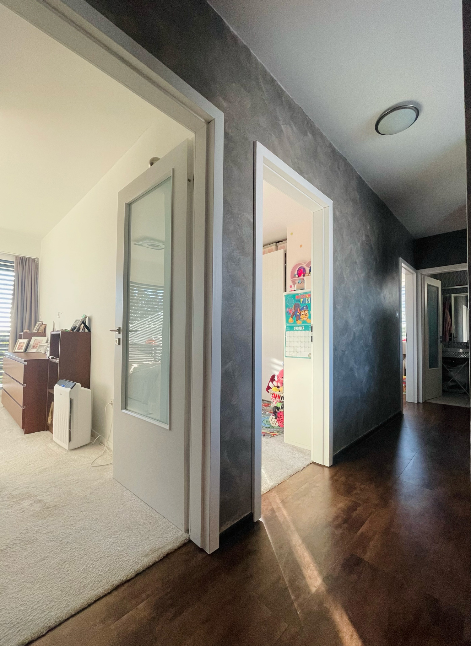 Az emelet hálószoba, gardróbszoba, gyermekszoba, dolgozó szoba és két fürdőszoba kiépítésű. A fürdőszobák kádas/zuhanyzós, illetve sarokkádas kialakításúak. A háló és gyermek szobából az épületen végig húzódó 16 m2 területű, panorámás teraszra léphetünk.