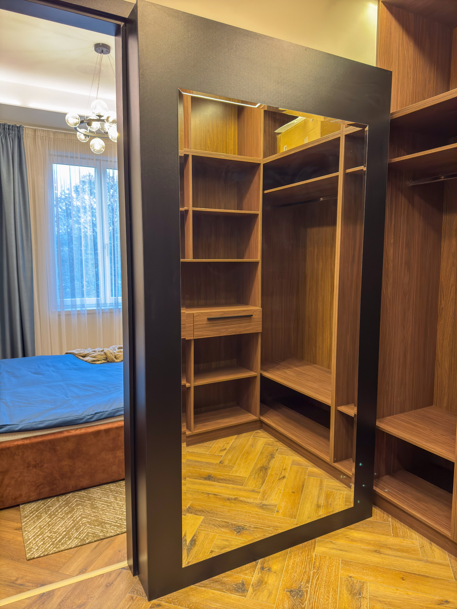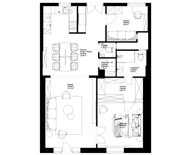A lakásba lépve, az előszobából nyílik egy kisebb dolgozó- vagy vendégszoba. Itt található szintén egy háztartási/gépészeti helyiség is, valamint egy különálló WC. Tovább haladva az egyedi, sötétkék színű, teljesen gépesített konyhába jutunk, amely a nappalival egy légtérben található. Az étkező elválasztja a konyhát a tágas, napfényben úszó nappalitól. A nappaliból igényes tolóajtón keresztül érhető el a nagy méretű hálószoba, amelyhez saját gardróbszoba és kádas fürdőszoba tartozik.