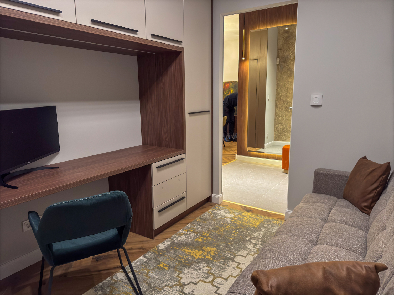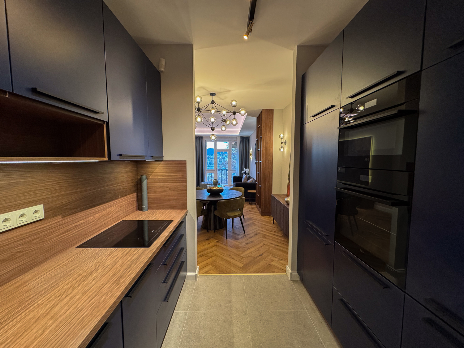 Upon entering the apartment, you are welcomed into the entrance hall which leads to a smaller study or guest room. Moving forward, you’ll find a custom-built, dark blue, fully equipped kitchen, seamlessly connected to the dining area and the spacious, sun-filled living room. The entrance hall also provides access to a utility/mechanical room and a separate toilet.