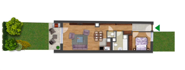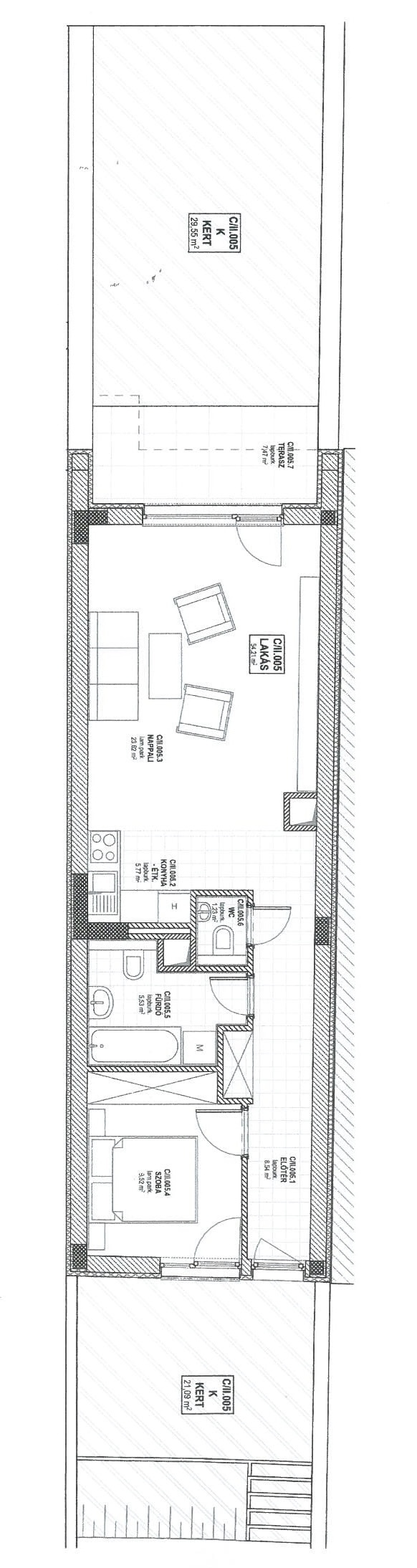 Az ingatlanhoz tartozik egy elő- és egy hátsókert is. Az előkert 21 nm-es, innen lépünk be a lakásba is, a hátsó kert 29 nm-es, ez teljesen független a lakóparktól, így privát teret biztosít akár egy kerti sütögetéshez, akár baráti beszélgetésekhez.