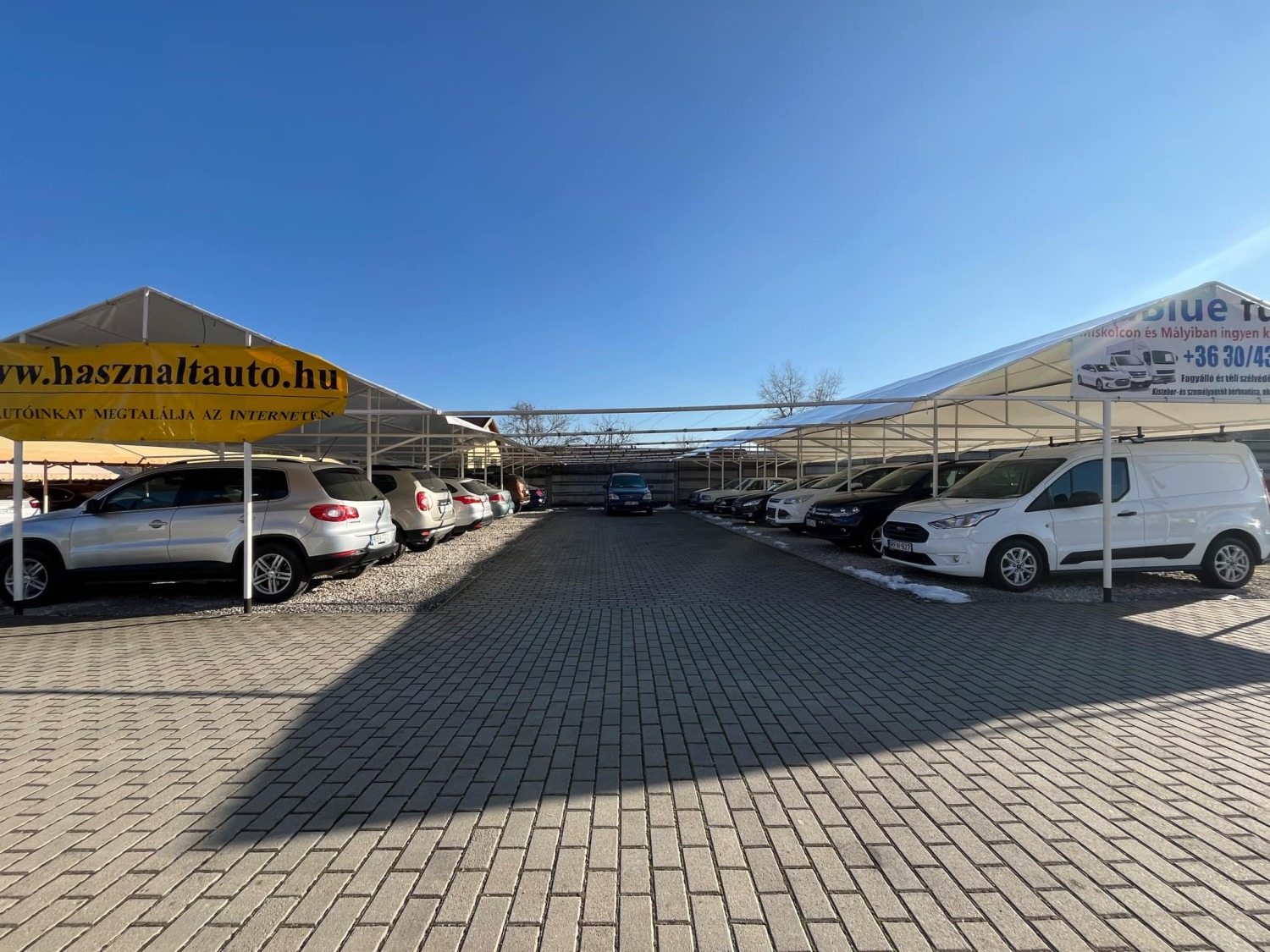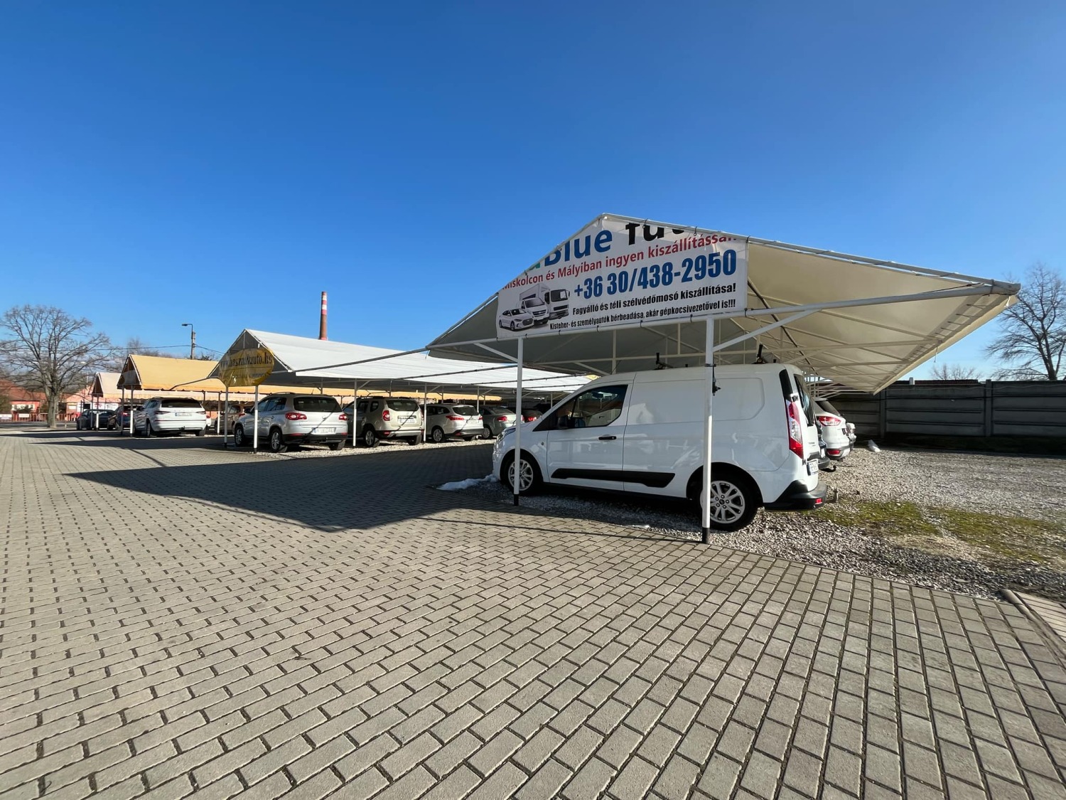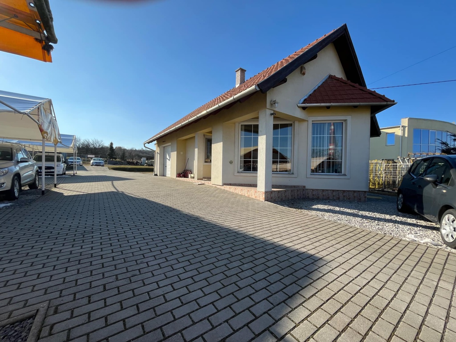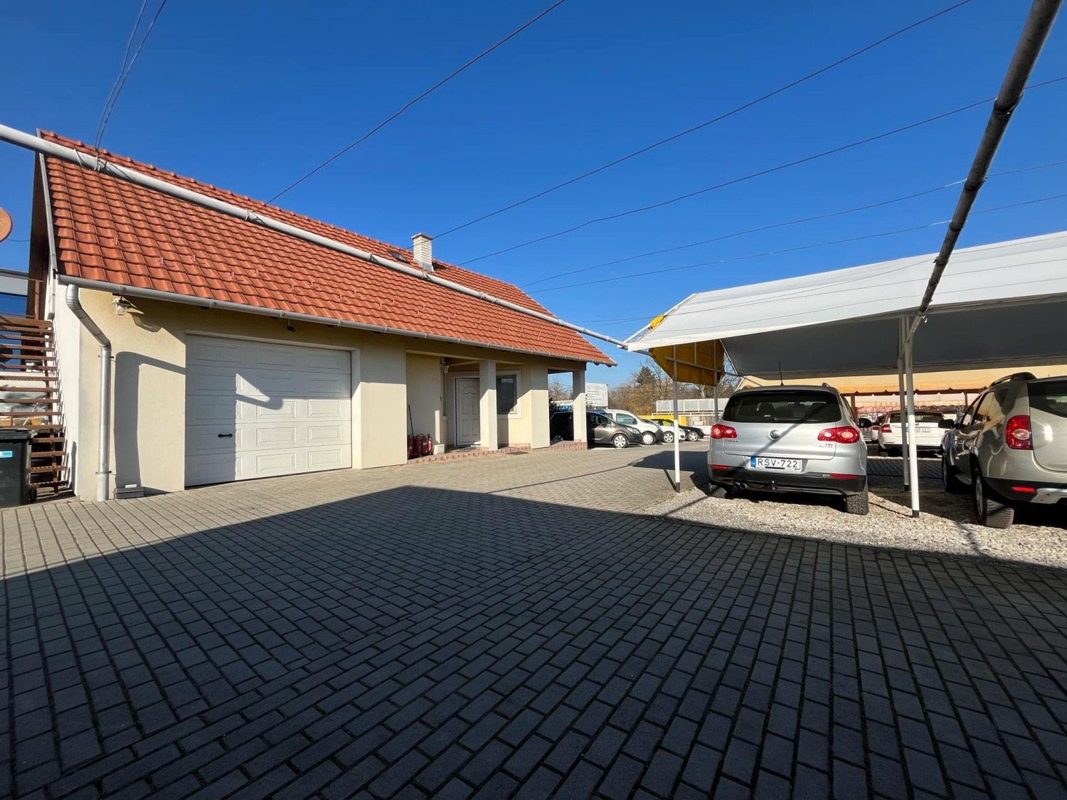 A terület felén található 4db fedett sátor, mely 28 db gépjármű fogadására alkalmas. Egy 2002-ben téglából épült 95 nm-es irodaépület, melyben kialakításra került a fogadótér, konyha, női, férfi illemhelyiség zuhanyzóval, valamint egy garázs.