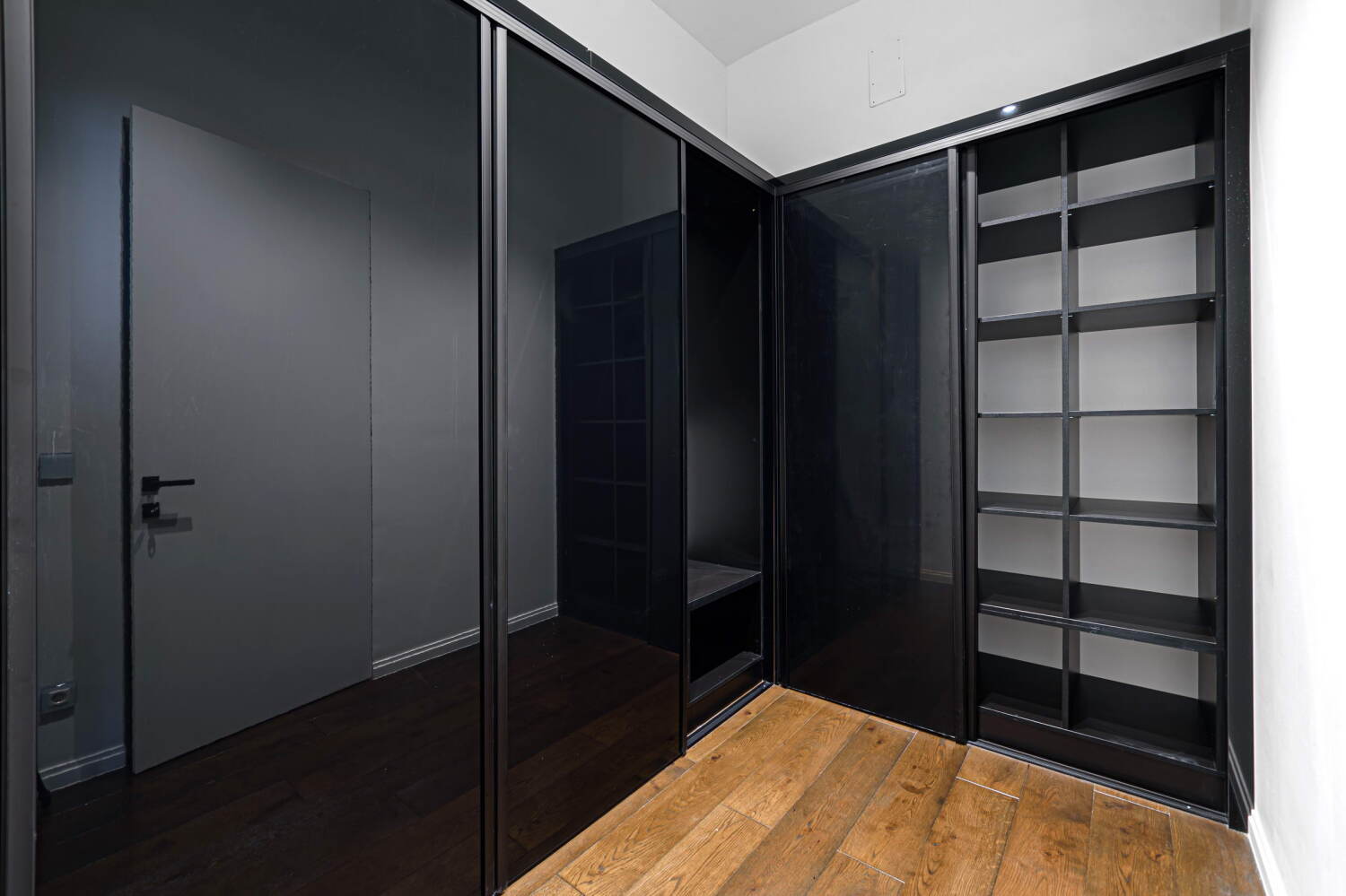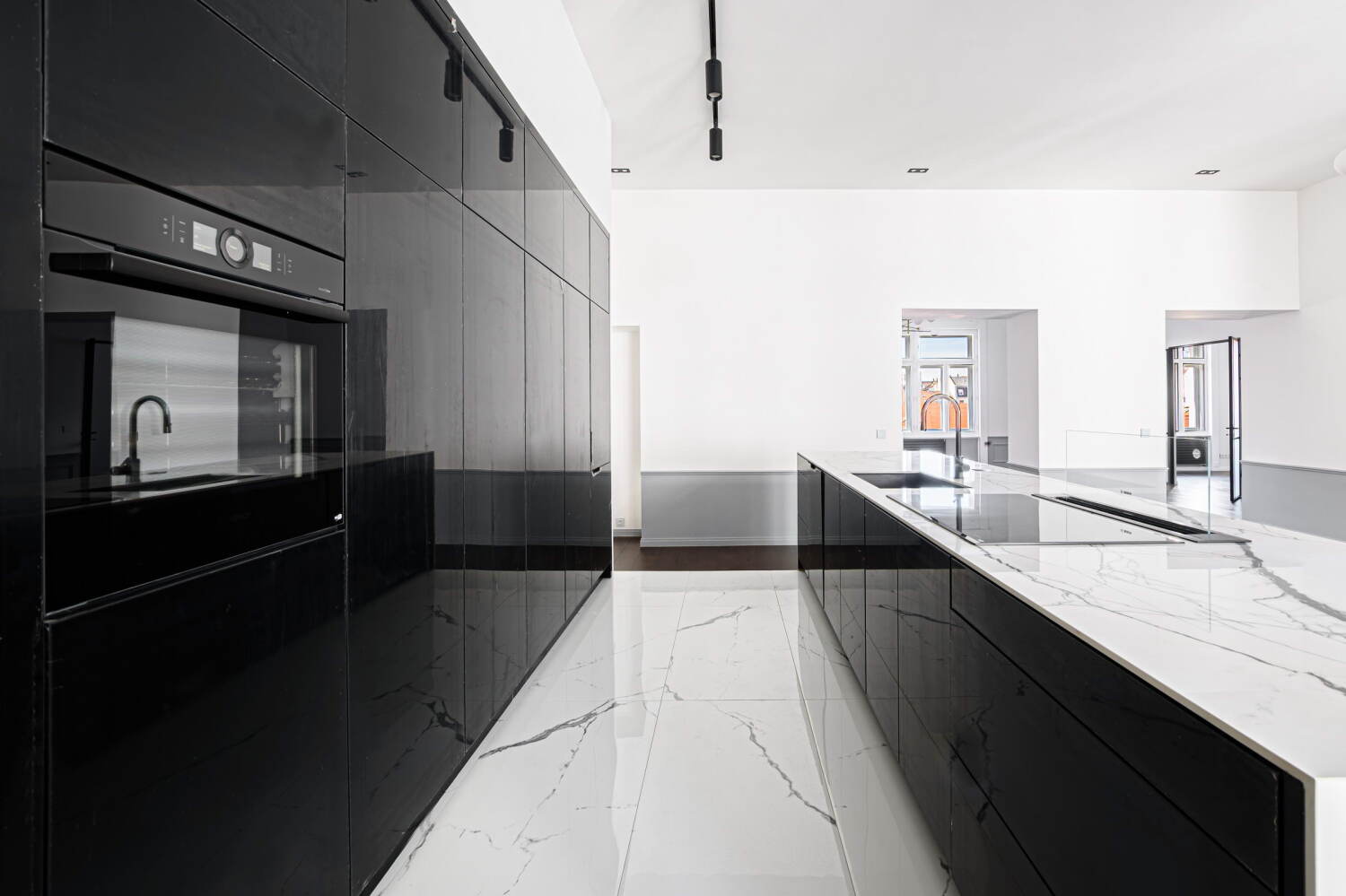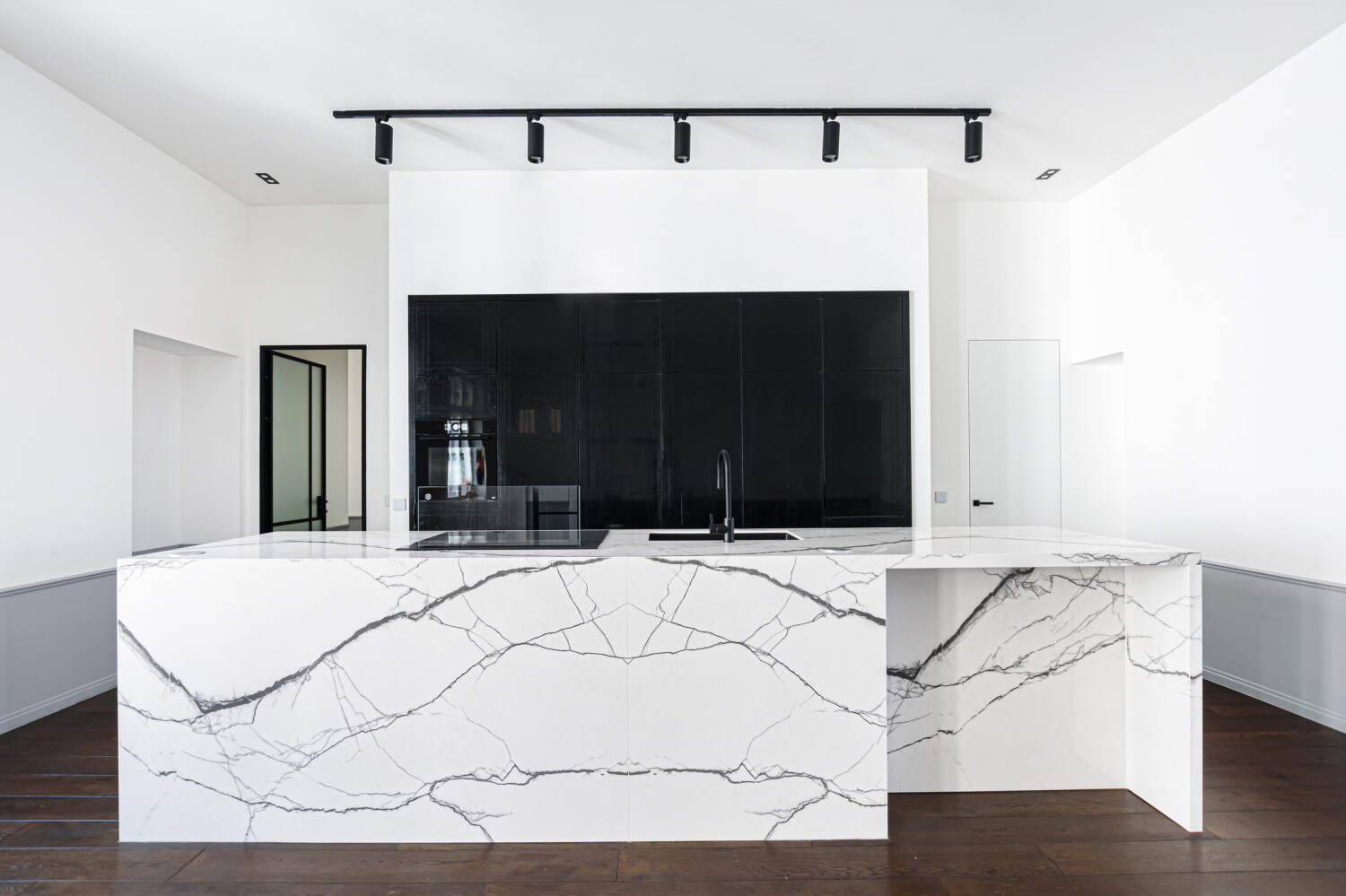 -konyha egyedi gyártás, asztalos készíti. Magasfényű fekete bútor, kvarcit munkalappal.