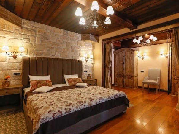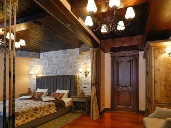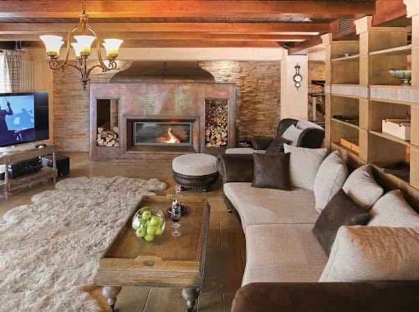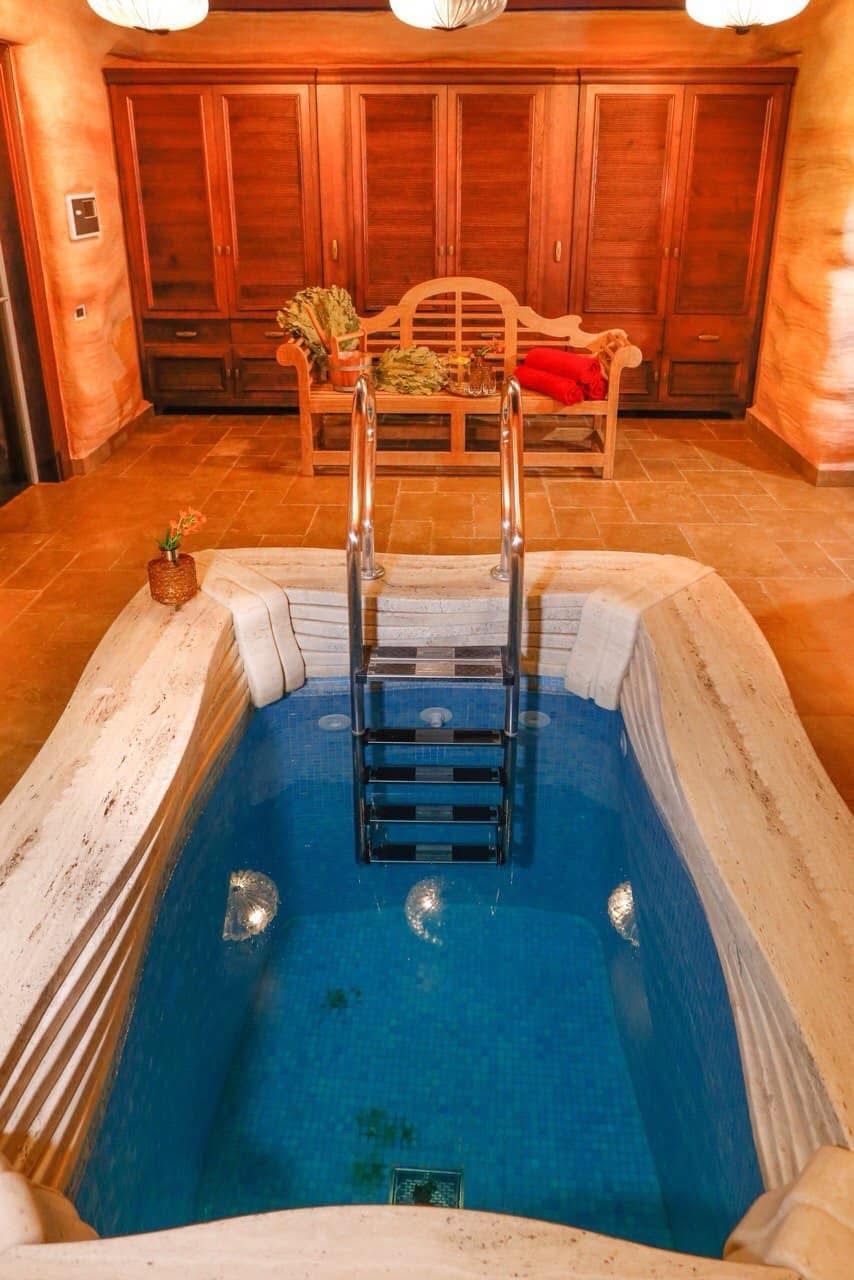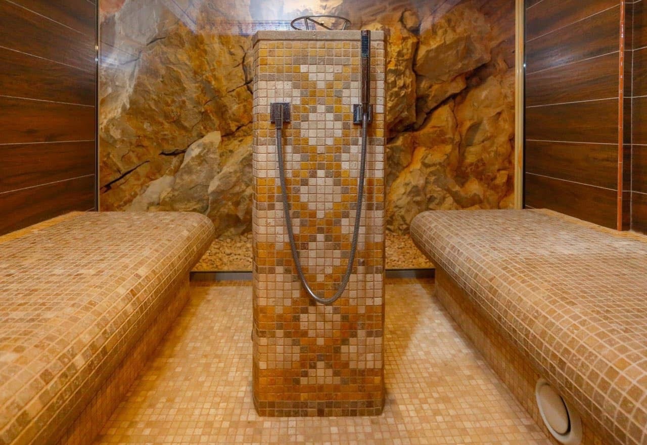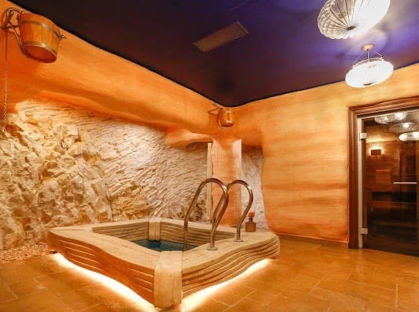 A földszinten tágas hálószoba saját fürdőszobával és terasszal, konyha és étkező, nappali kandallóval, SPA rész, orosz szauna, kis fedett medence, relaxációs terület, fürdőszoba.
