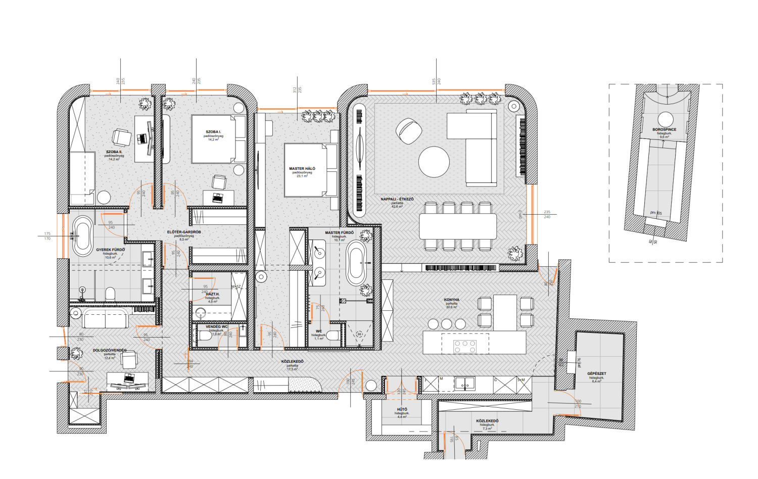 Extra helyiségek: háztartási helyiség, gardrób, kamra, hűtőszoba, saját borospince