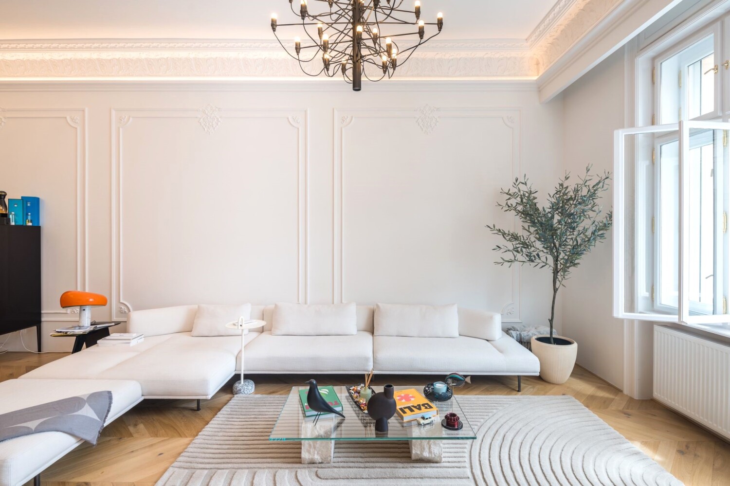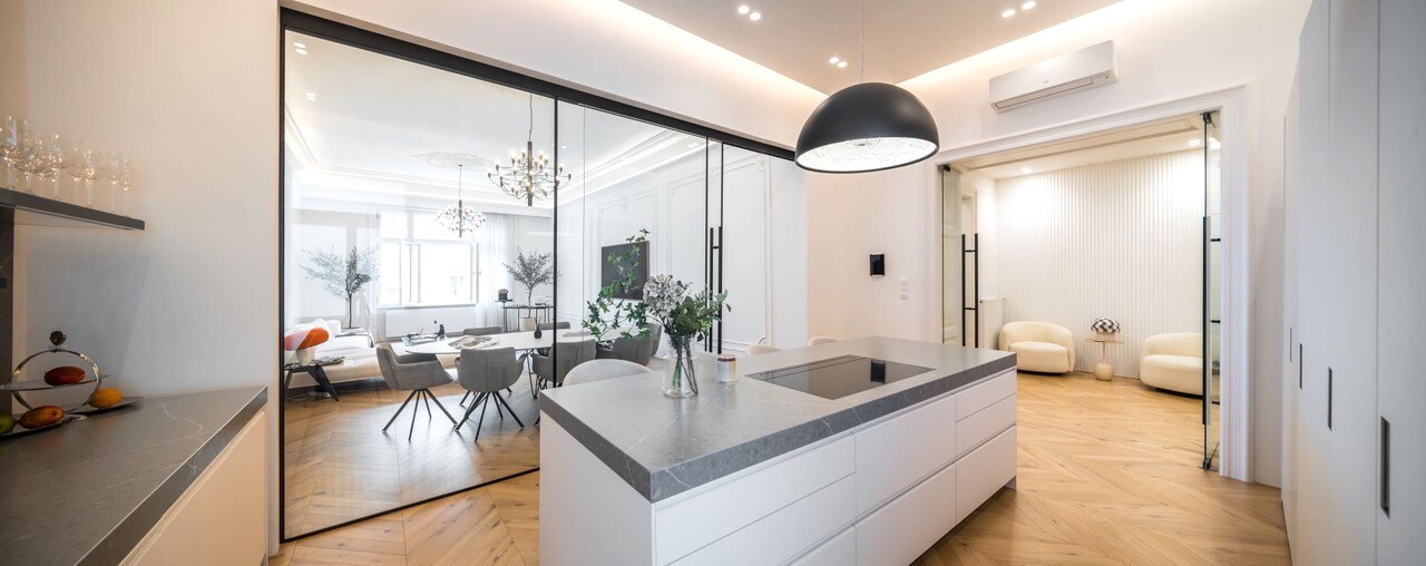 Elegáns belső terek: A lakás központi eleme a tágas, egy légterű nappali-étkező, amelyet egy csúcsminőségű, olasz Arclinea konyha egészít ki – Miele gépekkel, rejtett ajtókkal, kvarc munkalapokkal és diszkréten integrált elszívóval.
